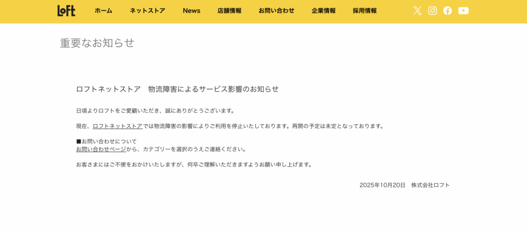 生活雑貨店のロフトを展開する株式会社ロフトが10月20日、ロフトネットストアを停止していると発表しました。物流障害の影響によるもので、再開の予定は未定となっています。