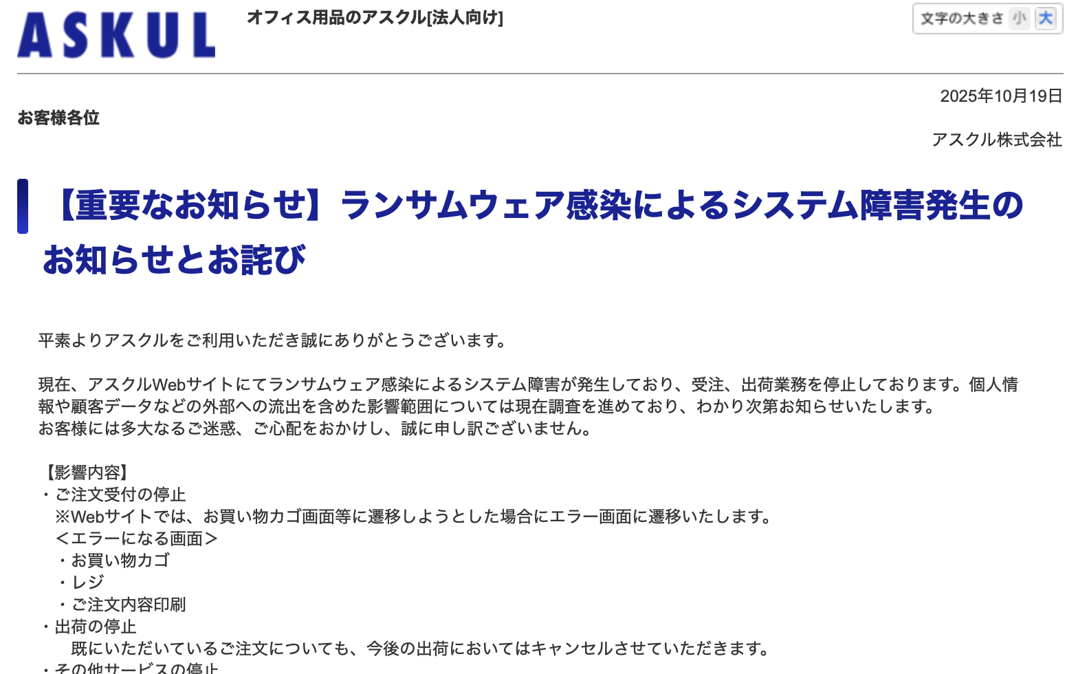 アスクル、ランサムウェア感染でシステム障害 受注・出荷業務を全面停止
