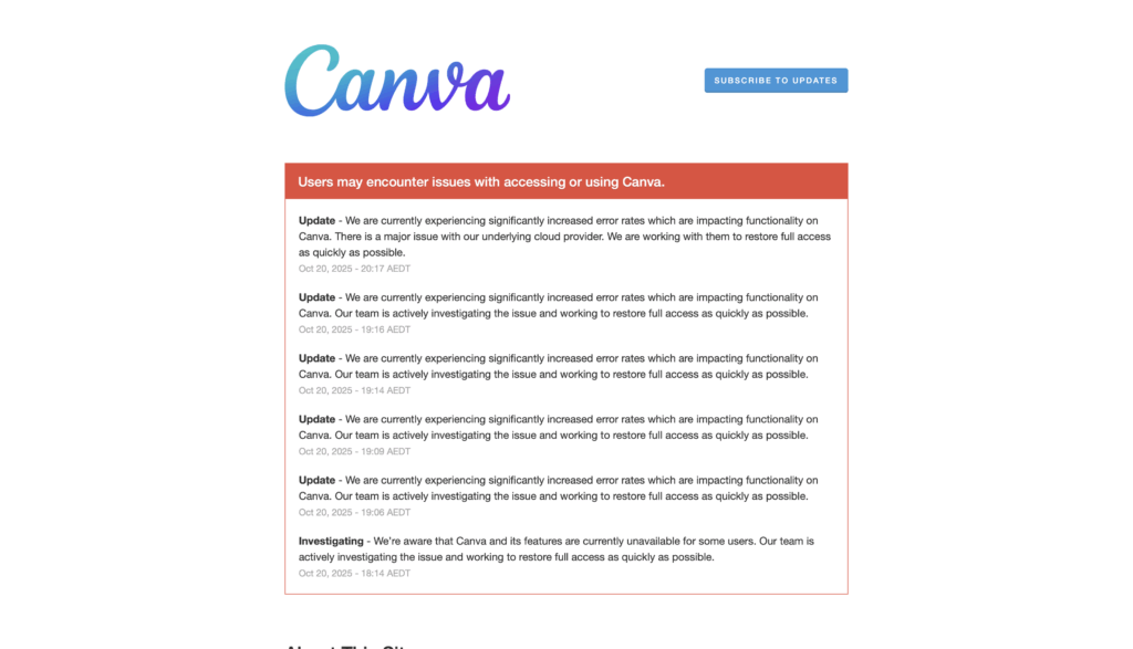 最新の状況については、Canvaの公式ステータスページ(https://www.canvastatus.com/)で確認できます。